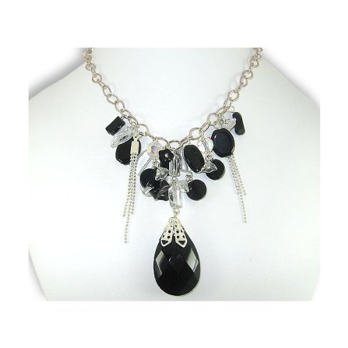 Collier fantaisie, noir et blanc, réalisé sur un support rigide en métal argenté et composé de perles en verre, en résine et d'une goutte ajourée en nacre