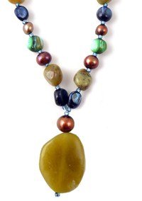 Beau collier comprenant de belles pierres telles que la Jade New Fire, copeaux Péridot, oeil du tigres et perles d'eau douce. Boucles réglables à l'arrière pour modifier la longueur.