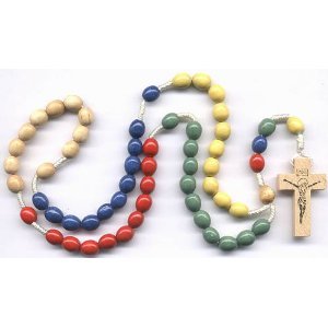 Chapelet missionnaire en bois sur corde. Le chapelet représente les 5 continents avec des couleurs différentes. Chapelet de poche mesurant 23cm.