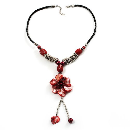 Collier Cordon Gland Cuir Fleur Composé Coquillage Rouge Corail