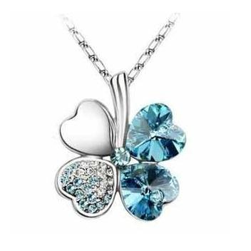 Femme Cristal Collier Trèfle à Quatre Feuilles Porte-bonheur Cristal et Chaîne chaine 18 inches en Plaqué Or Blanc 18 Carats- Bleu Lagon