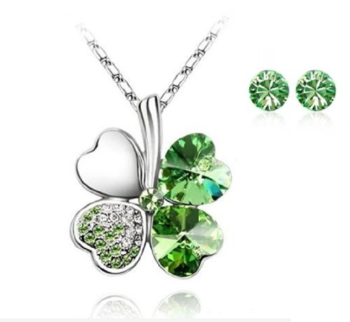 Parure Collier et Clous d'Oreille Trèfle 4 feuilles Coeur Porte-Bonheur - Cristal - Vert