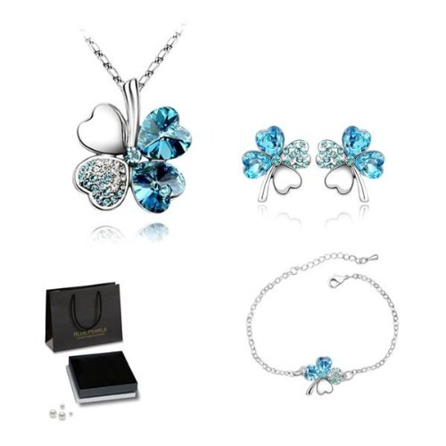 Set Pendentif, Bracelet et Boucles d'Oreilles Trèfle 4 feuilles en Cristal de Swarovski Elements Bleu Collier, bracelet et boucles d'oreilles assortie en forme de Trèfle à 4 feuilles, véritable porte bonheur. Monture en plaqué or blanc 18 carats (3 couches). Feuilles serties de cristaux blancs et bleus et de Cristaux de Swarovski Elements bleus. Couleur : Bleu ciel Monture : Plaqué or blanc 18 cts Pendentif : 26 x 21 mm, chaine incluse de 40 cm. Bracelet : 17cm Boucles d'Oreilles : 13 x 13 mm