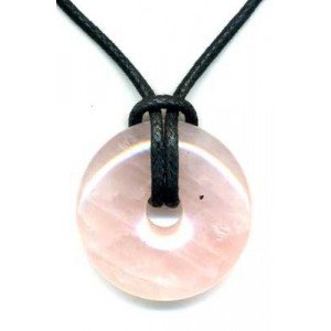 Quartz Rose Donuts Pi Chinois 30mm Pendentif avec Cordon. Le quartz rose est efficace pour les blessures de la peau, gerçures, abcès, hématomes.